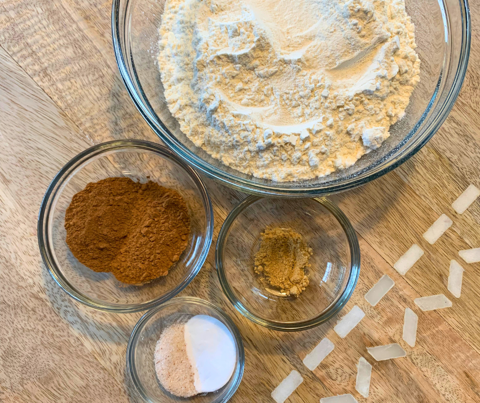 - Whisk together the dry ingredients: flour, baking soda, cinnamon, pumpkin pie spice, ginger and salt together in a large bowl.